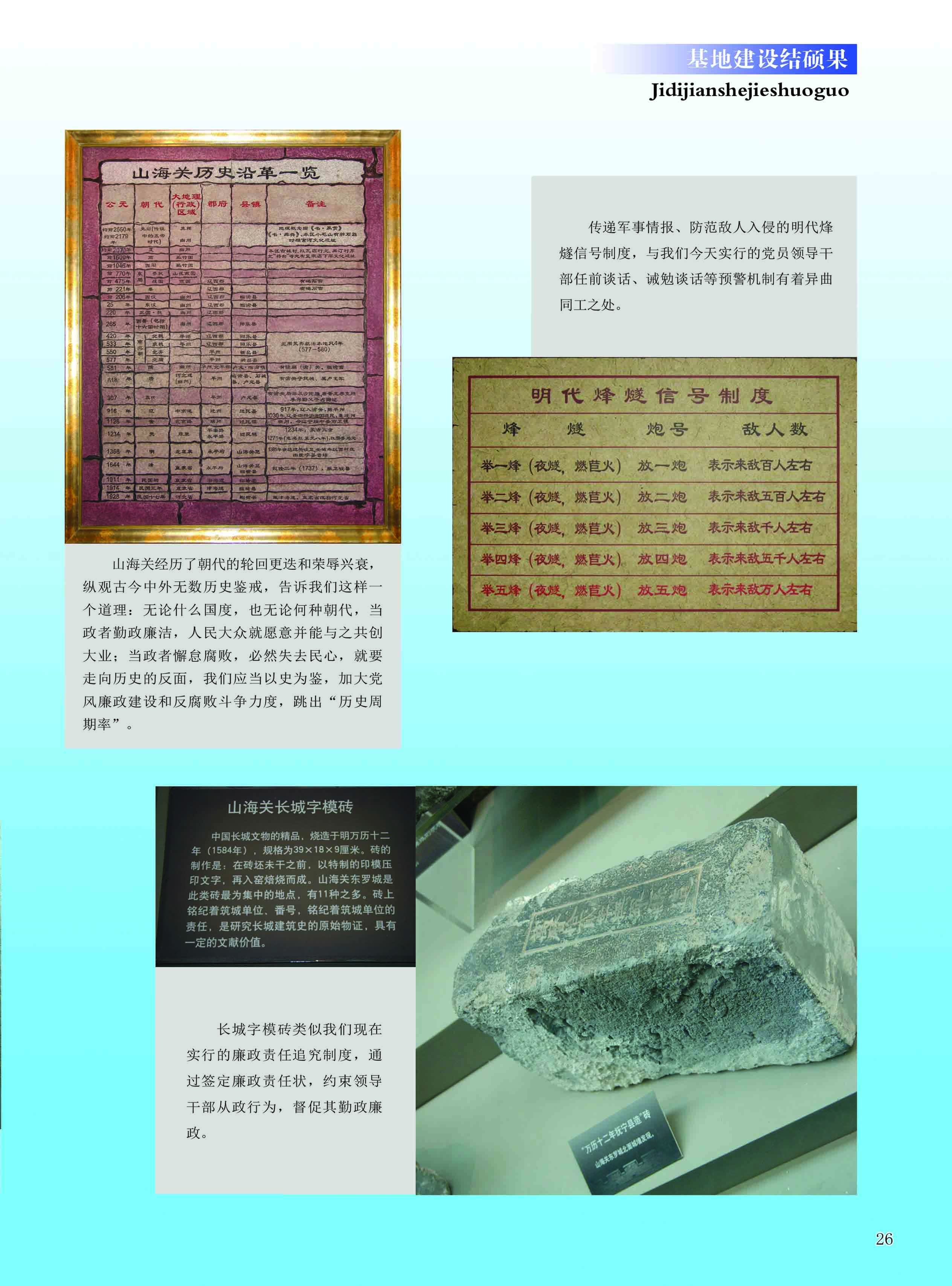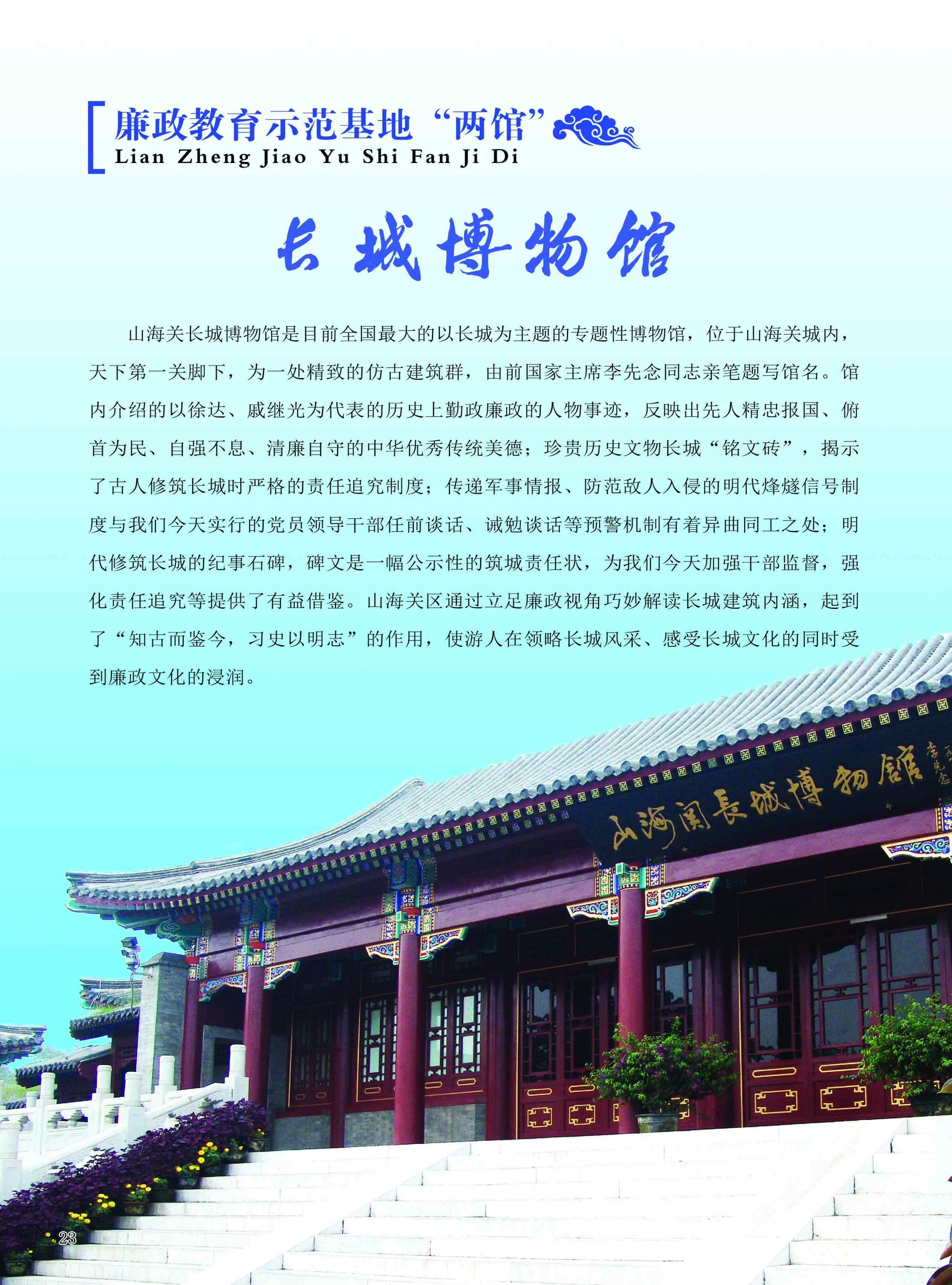 山海关长城博物馆是目前全国最大的以长城为主题的专题性博物馆,位于山海关城内,天下第一关脚下,为一处精致的仿古建筑群,由前国家主席李先念同志亲笔题写馆名。馆内介绍的以徐达、戚继光为代表的历史上勤政廉政的人物事迹,反映出先人精忠报国、俯首为民、自强不息、清廉自首的中华优秀传统美德;珍贵历史文物长城“铭文砖”,揭示了古人修筑长城时严格的责任追究制度;传递军事情报、防范敌人入侵的明代烽燧信号制度与我们今天实行的党员领导干部任前谈话、诫勉谈话等预警机制有着异曲同工之处;明代修筑长城的纪事石碑,碑文是一幅公示性的筑城责任状,对于我们今天加强干部监督,强化责任追究等提供了有益借鉴。山海关区通过立足廉政视角巧妙解读长城建筑内涵,起到了“知古而鉴今,习史以明志”的作用,使游人在领略长城风采、感受长城文化的同时受到廉政文化的浸润。